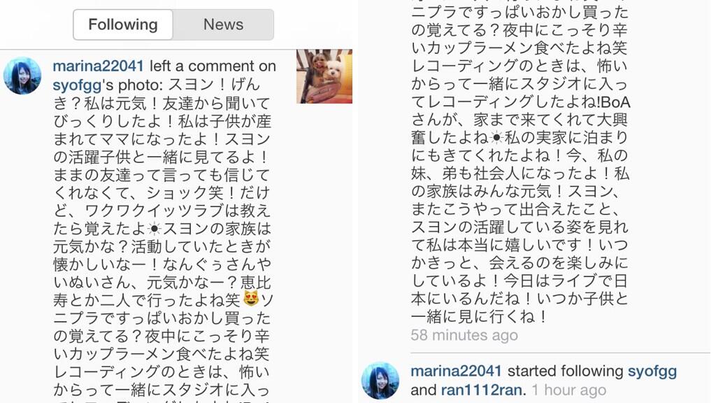 Sooyoung finally found her long lost Route0 friend 'Marina Takahashi' with the help from Marina's friend who saw Sooyoung post on June 2nd. Marina created IG and leaving a long comment to Sooyoung. Sooyoung has also following her back and replied her,